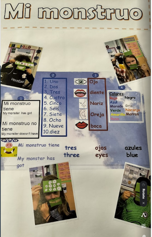 Miss Lawrence, with the help of her excellent Spanish Ambassadors from each class, produces floor books, in which children have recorded their learning for each topic and which showcase the progression of childrens’ knowledge across Key Stage Two. QR codes are displayed, which open up to show the children using their oracy skills, in order to devlop their confidence, spontaneity and fluency in Spanish. The beautifully-presented floor books show the creativity behind each of the activities the children partipate in, exemplified in this activity where children described a fictitious monster! All children have the opportunity to develop their written communication in Spanish and the floorbooks also evidence how much the children enjoy their creative writing tasks, where they show can write for different pursoses with new grammatical concepts.