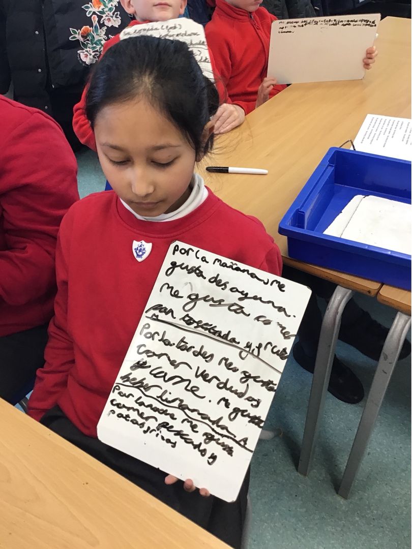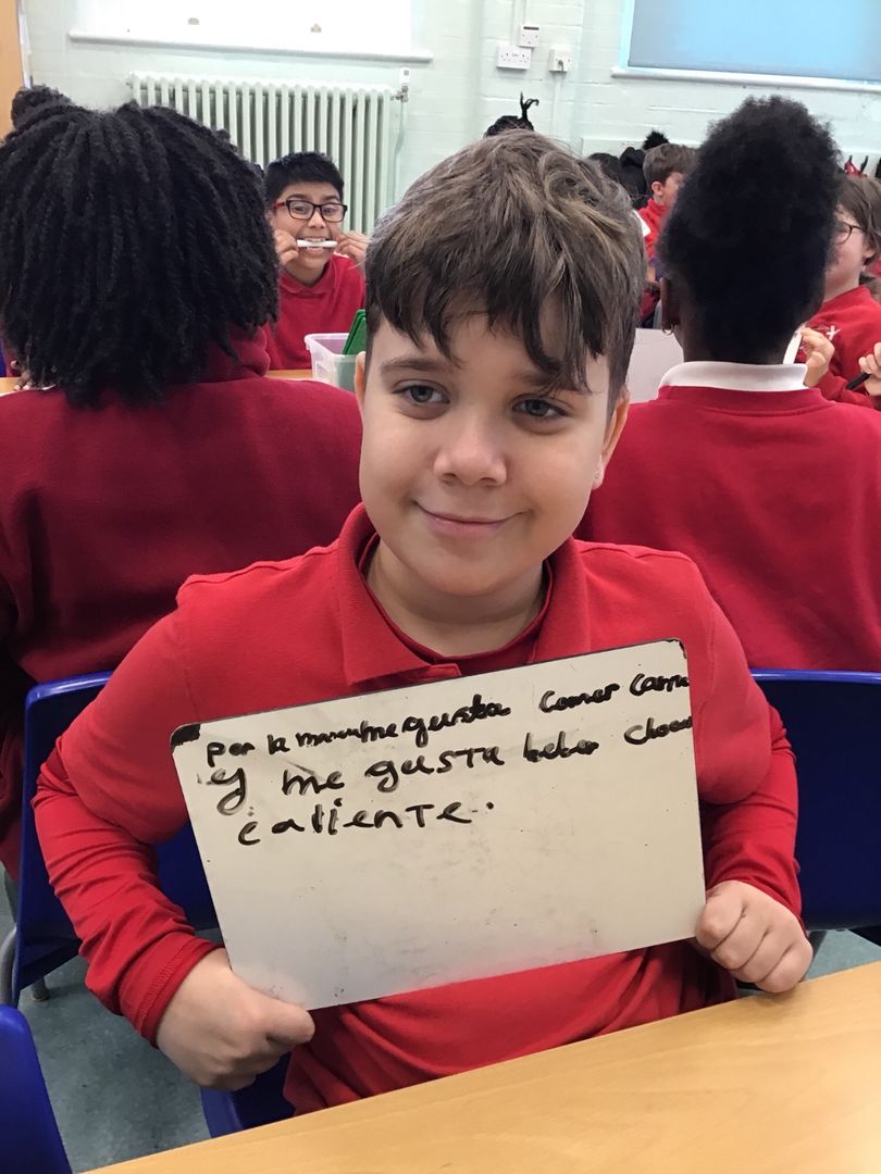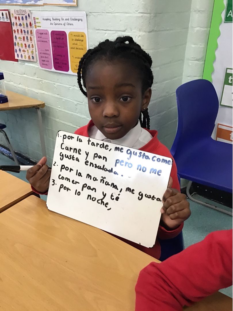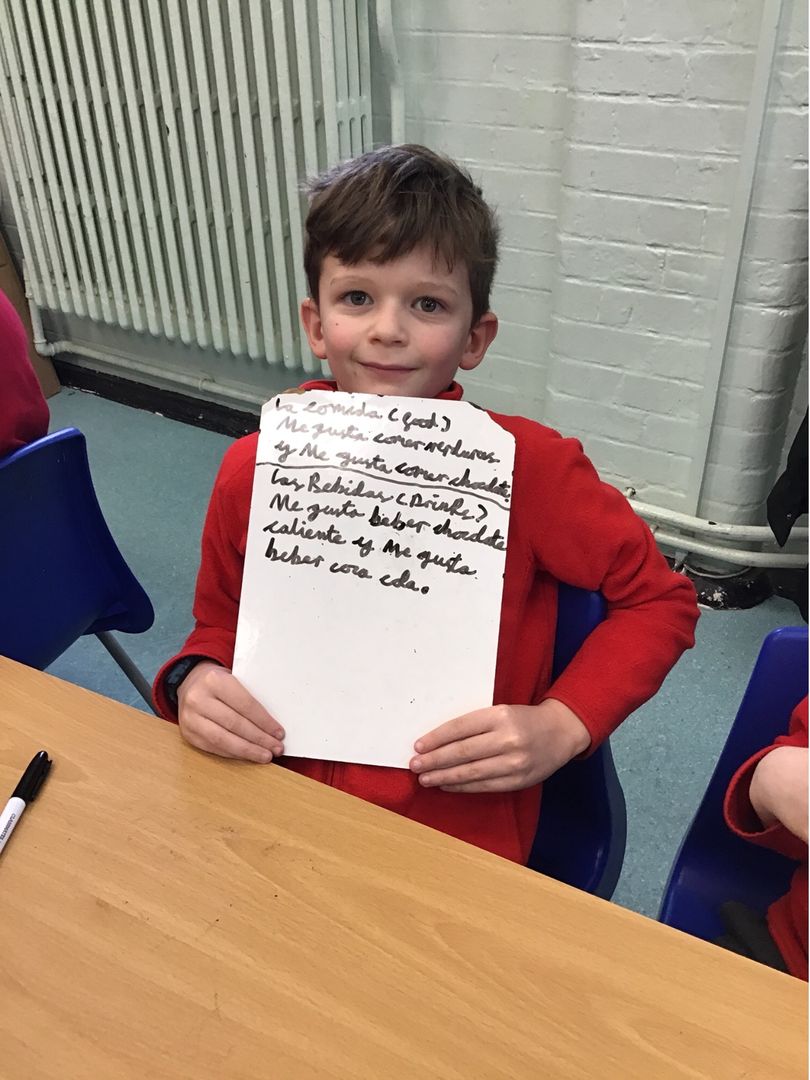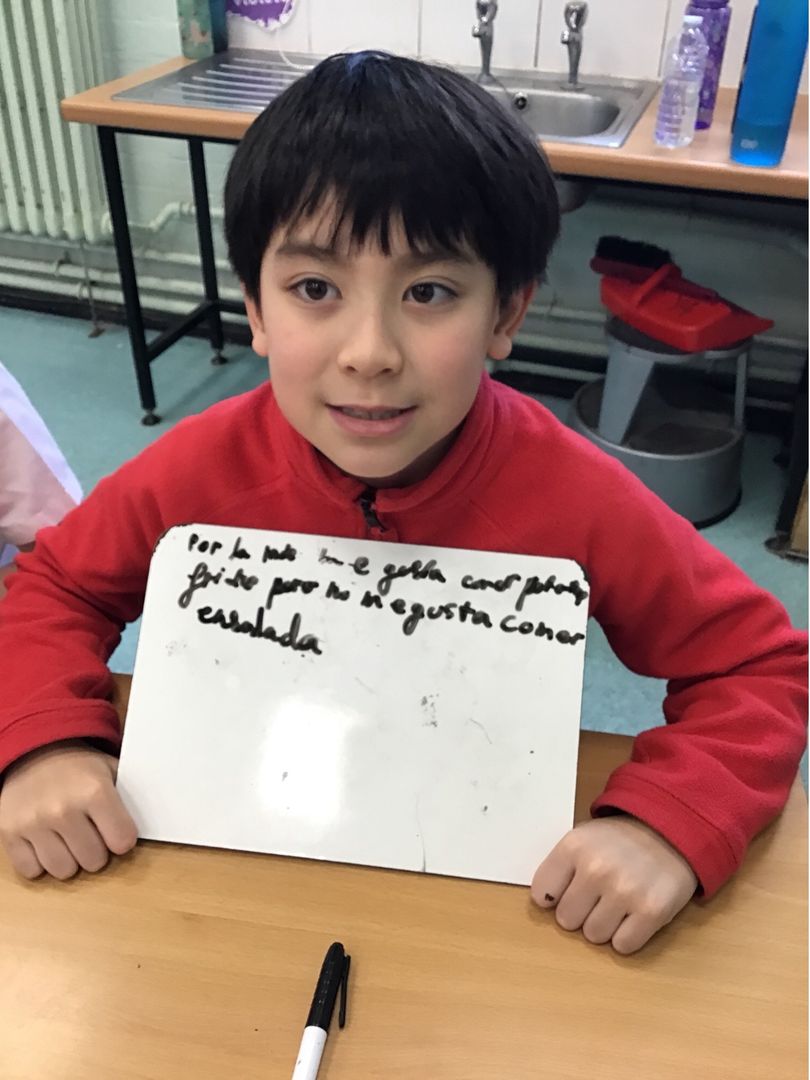 This week in Spanish, the children in Year 4 began to develop their writing skills, by using familiar sentence structures to write a short transcript expressing their opinions about the foods and drinks that they like to consume, at different times throughout the day. Once the children had manipulated the sentence structures, they then had an opportunity to share them with their peers. Take a look at some of their short passages…
