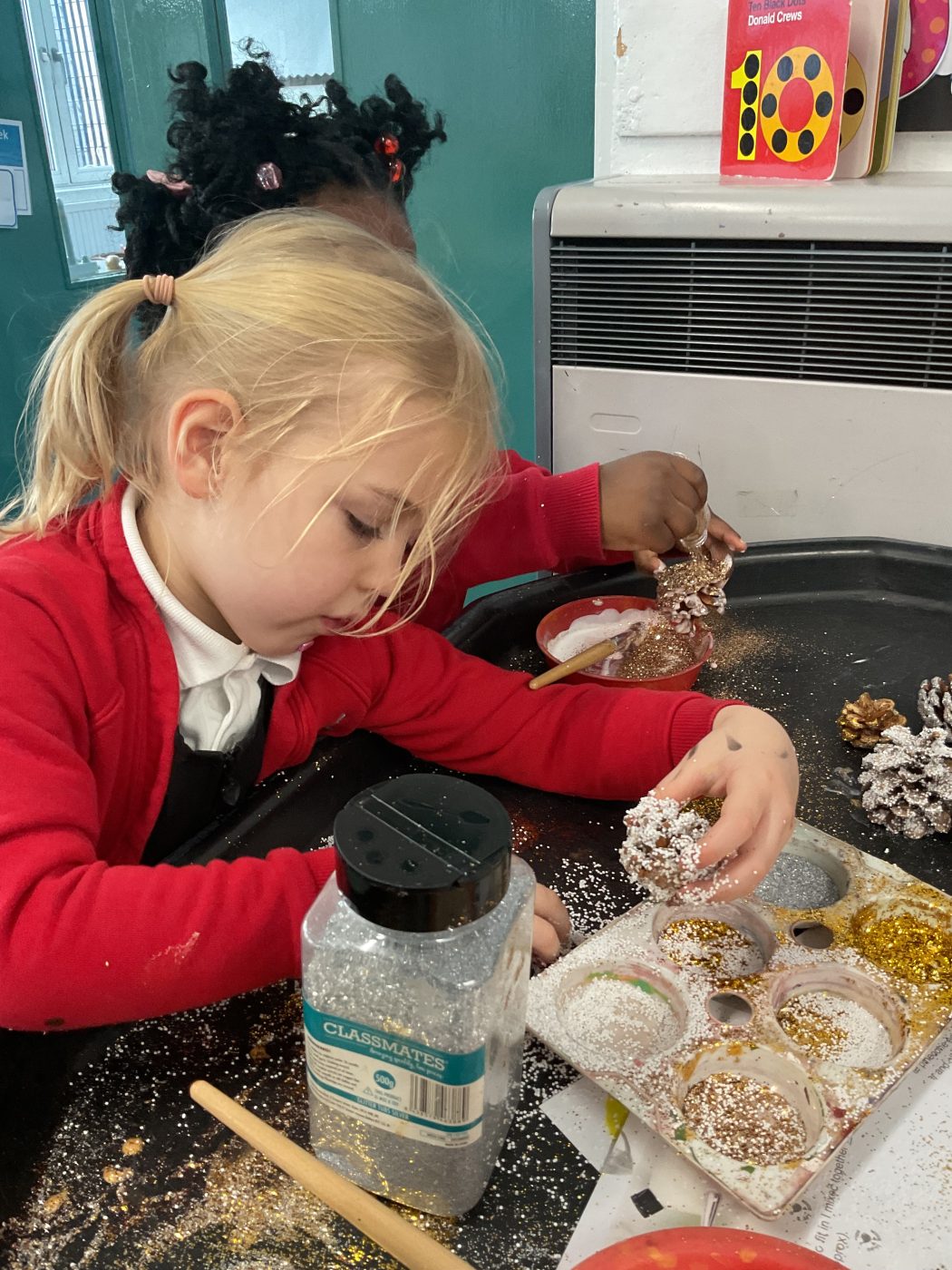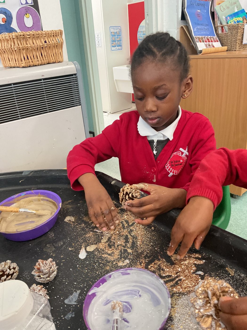 The week started with Christmas Decoration Day – we used metallic paints, PVA glue and glitter to decorate pinecones that are now hanging in the school hall.