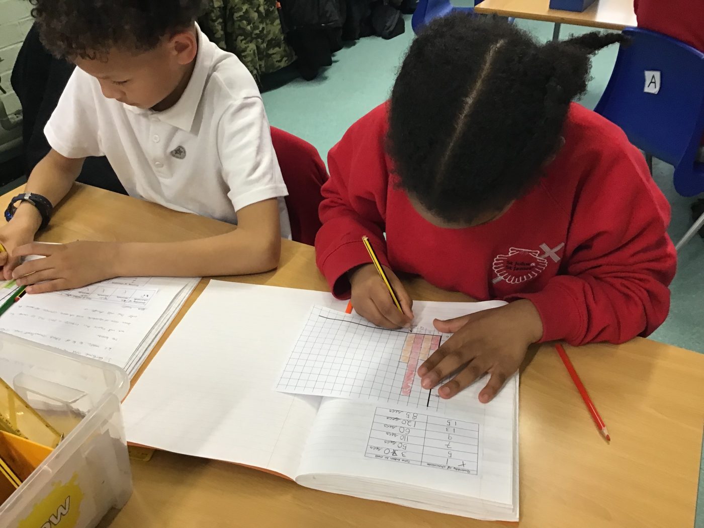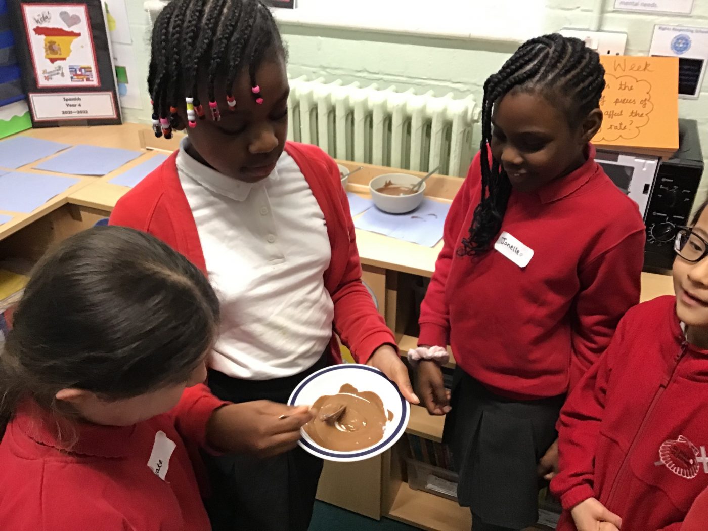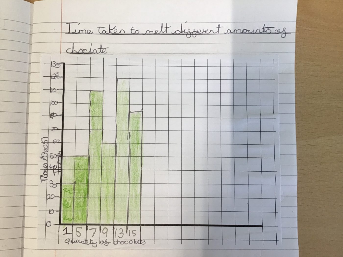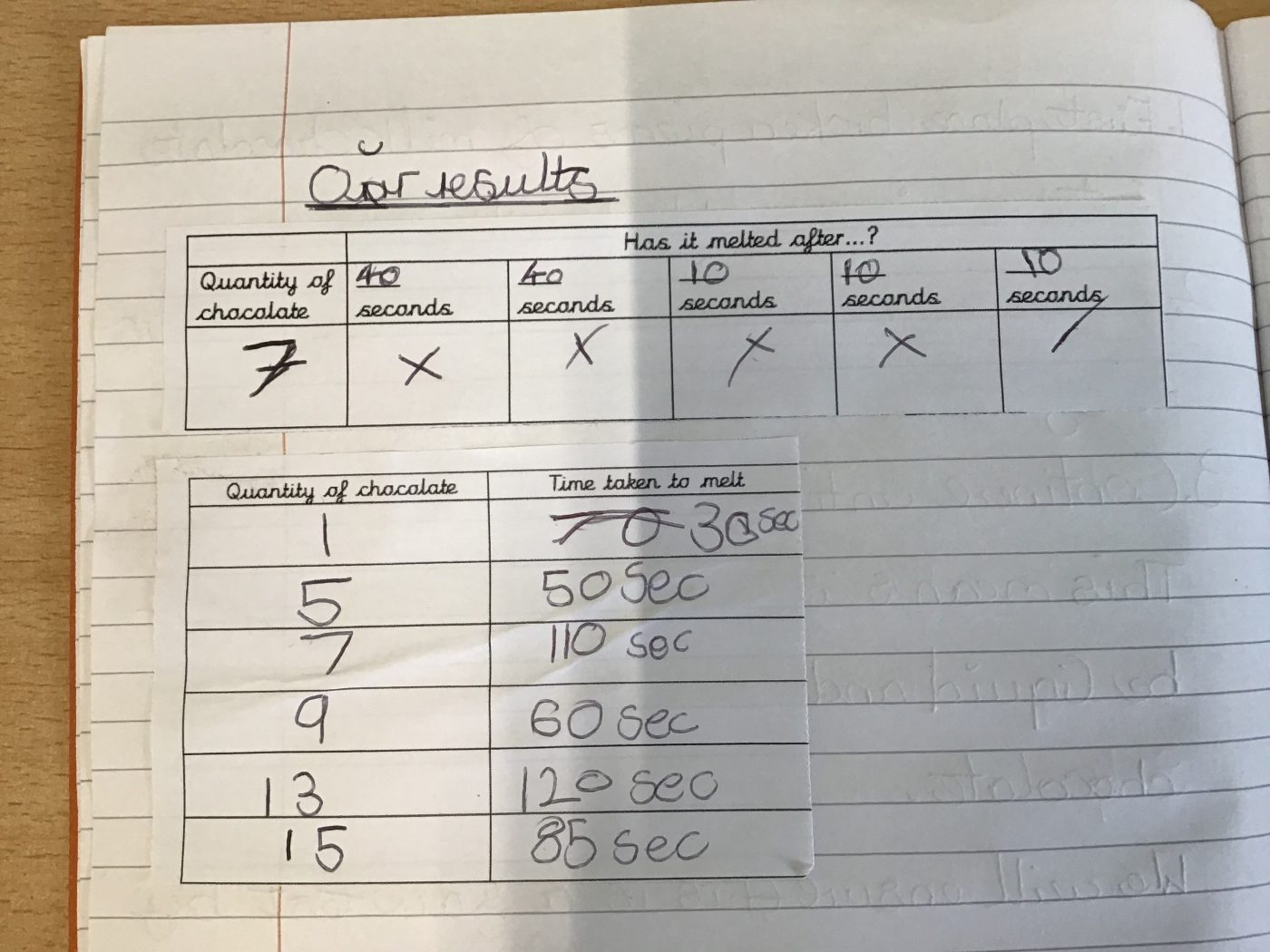 The class were split into 5 groups and shared the responsibility of timing, stirring and recording the results. Once all groups had finished, they shared their results and used the outcomes to spot patterns and make further predictions. The children found that the time did generally increase with the quantity of chocolate, however one result didn’t quite fit the pattern. They thought about why this could be and decided that there are many factors, like the handling of the chocolate before the enquiry and the heat inside the microwave after it had been used a few times, that could have affected these results.