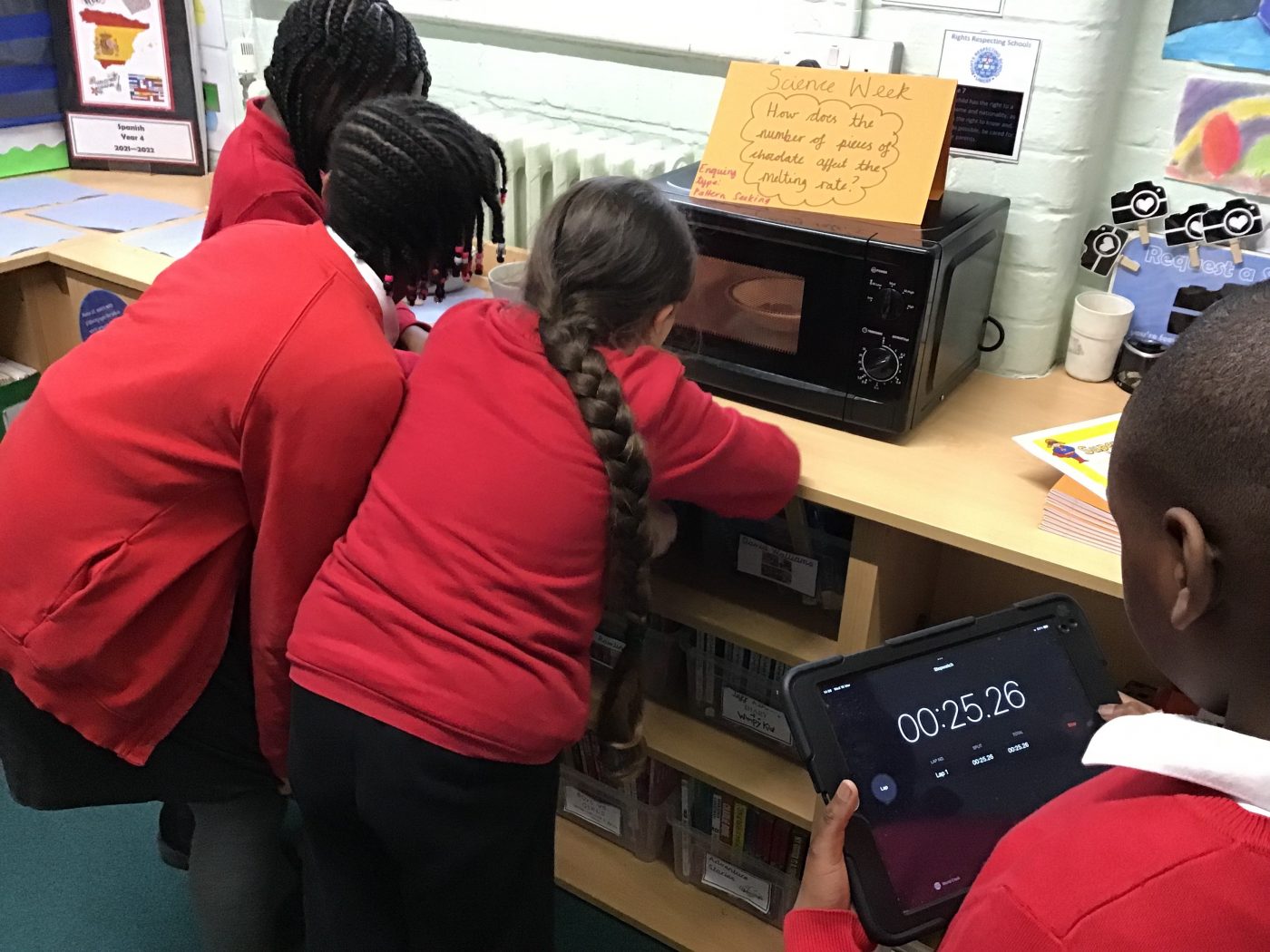 The children used their prior knowledge of melting and changing states to help them make a prediction about what they expected to find by the end of the enquiry. Some thought that the number of pieces would have a small impact on the melting rate, as the microwave produces quite a lot of heat in short spaces of time; others thought that the melting rate would significantly increase with the number of pieces of chocolate.