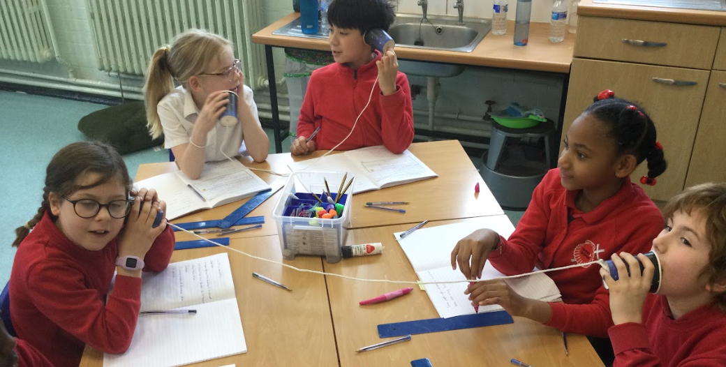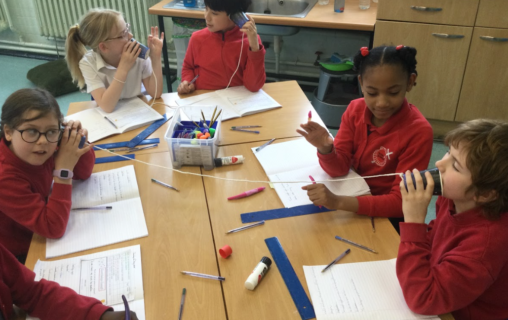 This was done by using string telephones, as they experimented with different materials such as cotton wool, cardboard, foil and cling film, by placing the material inside the cup to test whether it made a difference to the sound received at the other end of the string telephone.
