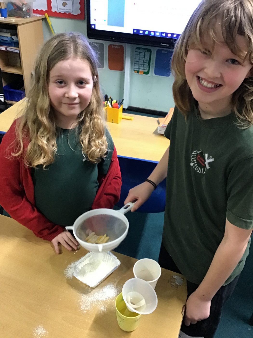 We discovered that salt dissolved in water does not separate using filtration and so we had to use evaporation. We also observed that there could be multiple ways to separate the same mixture, such as flour and pasta, which can be separated using sieving, passing the mixture through an appropriately sized funnel, or using our fingers to pick out the large pieces of pasta.