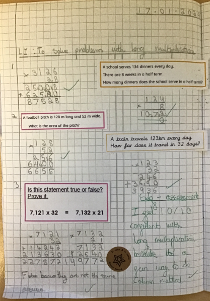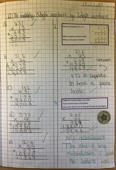 They have been multiplying increasing large numbers by 2 digits using the complex long multiplication method. We worked systematically, first multiplying by the ones digit, remembering to add a placeholder before multiplying by the tens digit, then finally adding the partial products. They put effort into making their workings neat and applied this method to solve a range of problems.