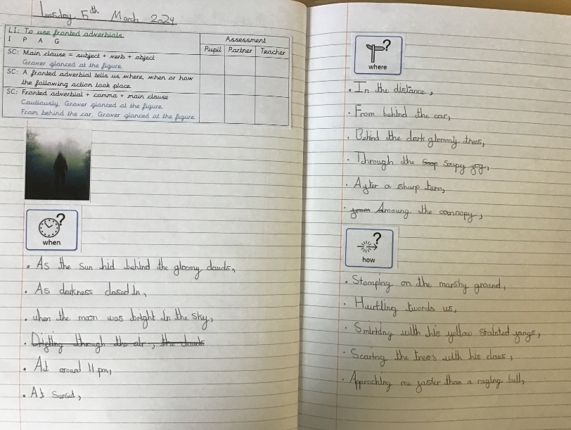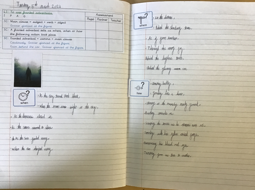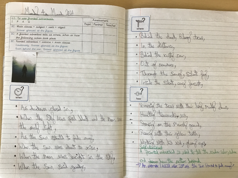 On Tuesday, our grammar lesson was focused on preparing fronted adverbials, which we would later use in our writing. We recalled that adverbials are used to describe when, where or how events take place. We all ensured we started our fronted adverbial with a capital letter – as it is the start of our sentence – and ended it with a comma.