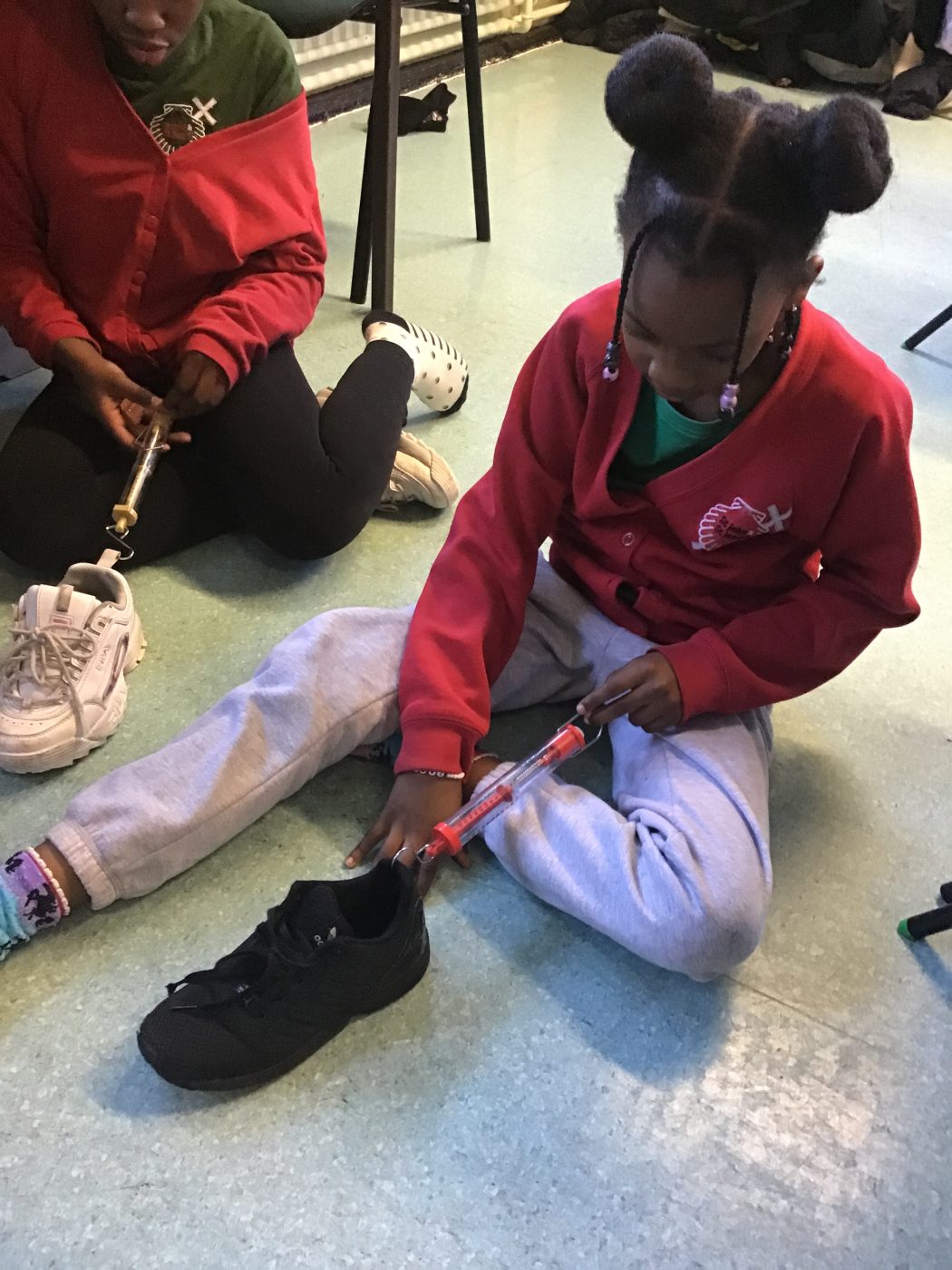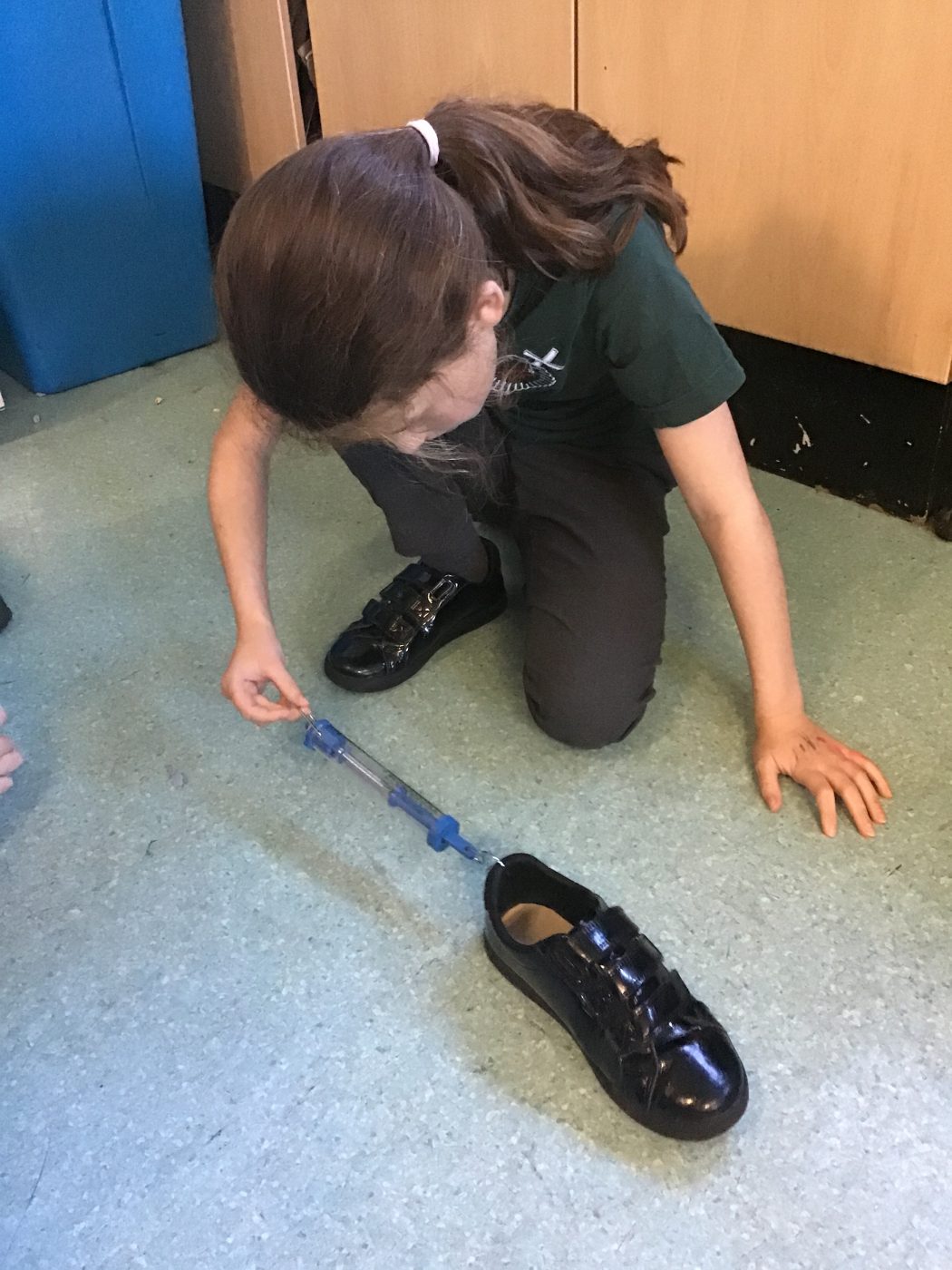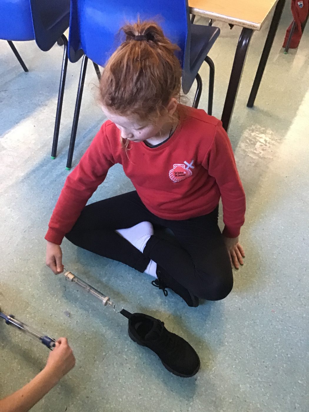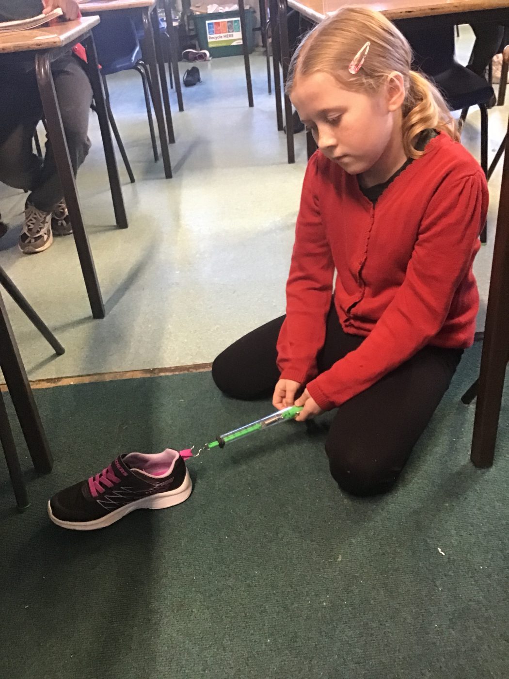 In science this half term we have been learning about forces. This week we planned and executed an experiment to measure the frictional force between our shoes and various surfaces. We used force meters to measure friction in Newtons and discovered that a greater force was needed to slide the shoe over the carpet, which tells us that there is more friction between the shoe and the carpet than other surfaces.