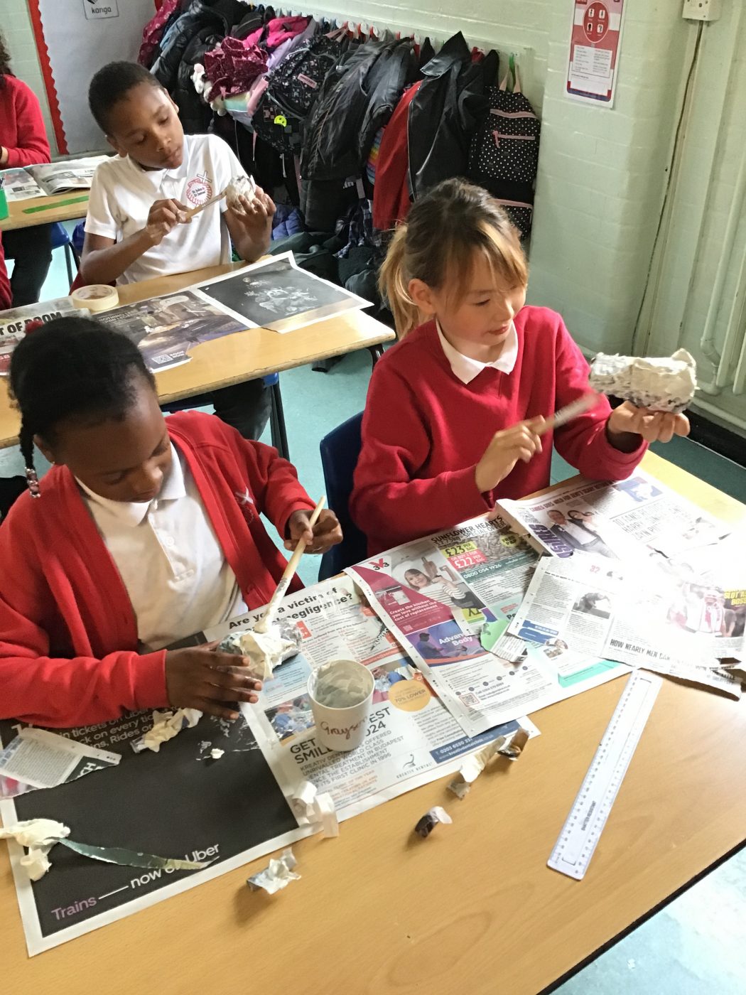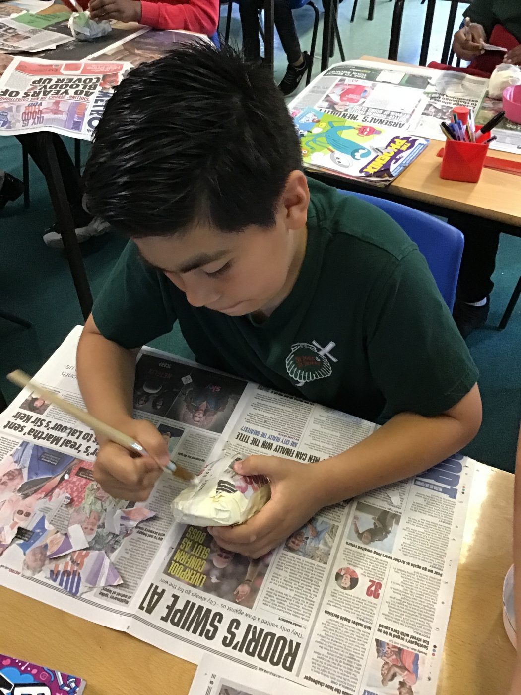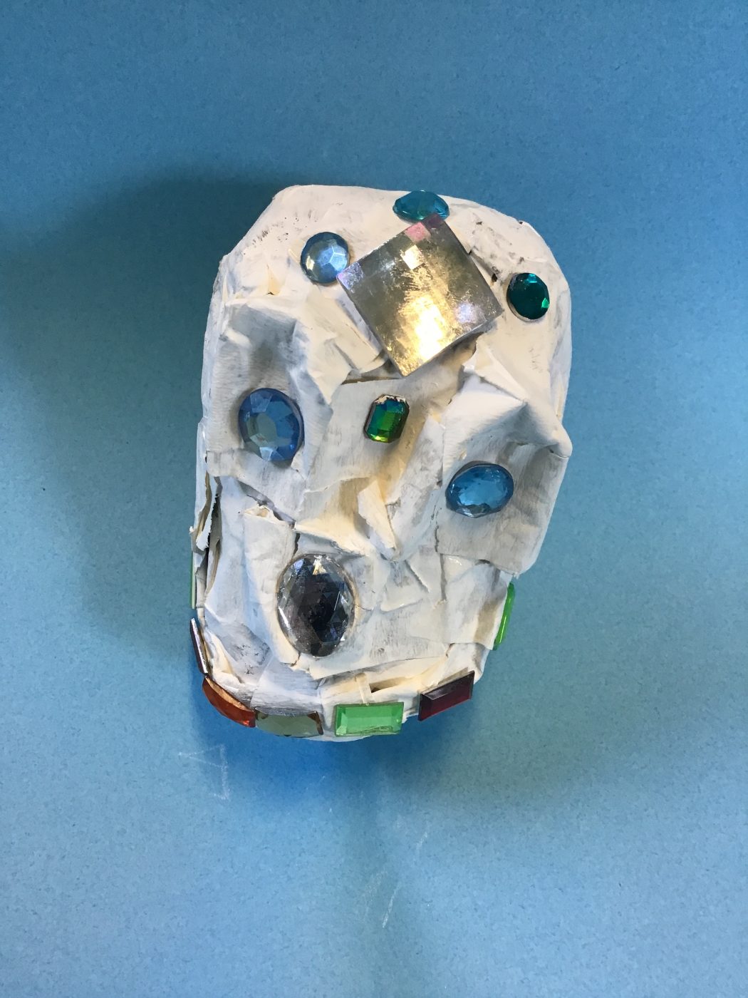 We developed our fine motor skills, scrunching paper into the desired forms, pushing indents into the form to create eye sockets, and moulding brow and nose details out of the paper mache.