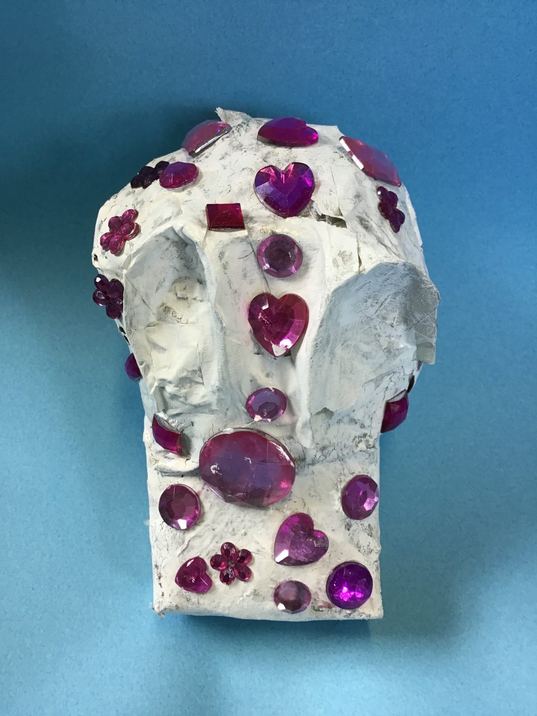 We studied his works The Physical Impossibility of Death in the Minds of Someone Living (1991), Mother and Child (Divided) (1993) and For the Love of God (2007). Inspired by his 2007 piece, we sculpted skulls out of paper mache and decorated them with gem embellishments.