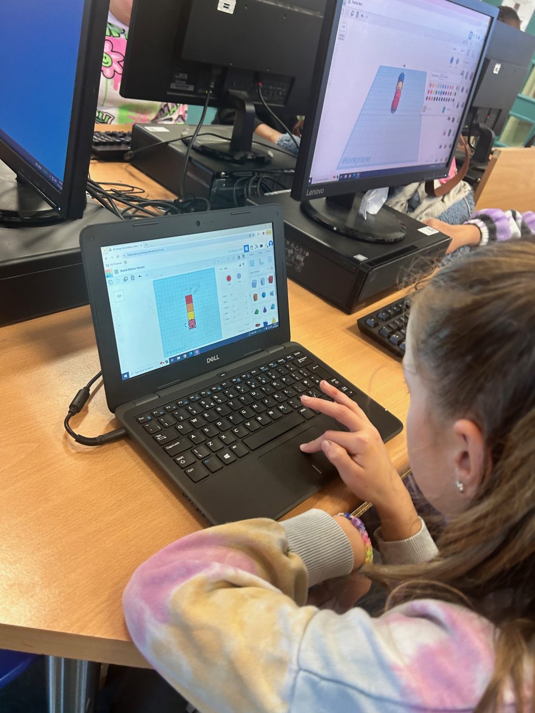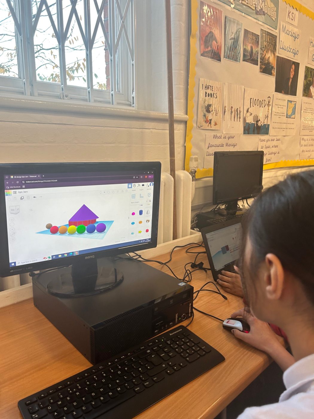 Then, we explored Tinkercad and played around with inserting 3D shapes, toggling the view and moving objects. This software was tricky to use, but the class displayed excellent resilience and even managed to create some 3D pictures! Take a look…