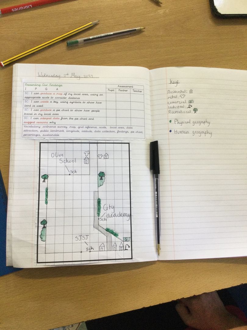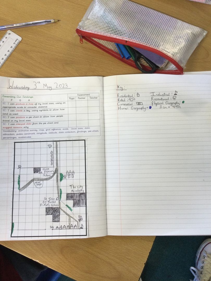 The children then worked in groups to create surveys – some children collected information on the different use of buildings in Hackney; whilst others looked at the modes of transport that were used. In the following lesson, the children developed their map skills by creating simple versions of a map to show what they had observed in the local area.