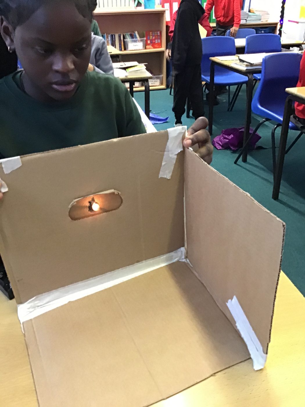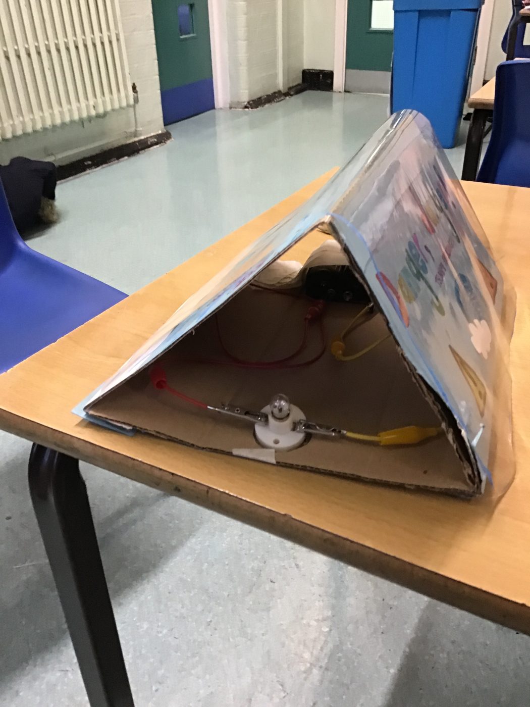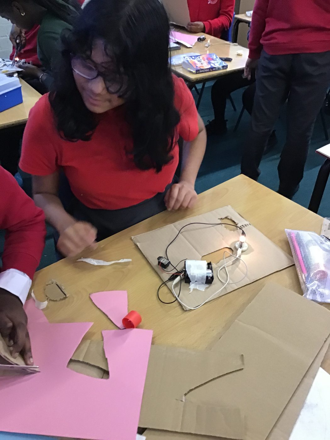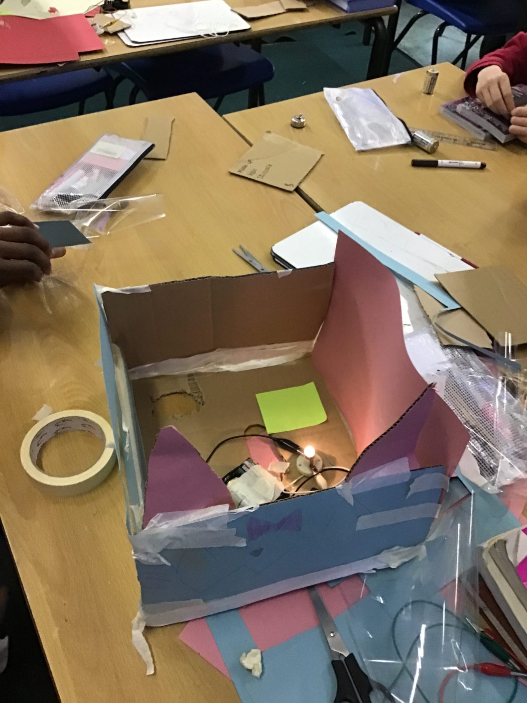 In pairs, we worked hard to build an electrical circuit. Some of us chose a simple series circuit; others chose to use a parallel circuit using a buzzer and a lightbulb. The children then worked on building the casing for their alarm, using their prior knowledge of strengthening structures and strong 3D shapes.