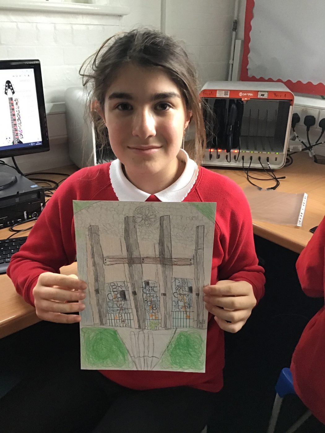 In their second piece of artwork, the children thought carefully about their most comfortable place in school; the place that makes them feel most at home. Some opted for the school office because it is warm and welcoming; others opted for the playground because this is where they have lots of fun. The children then used their observational drawing skills to bring these places to life.