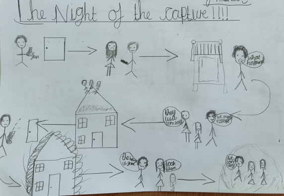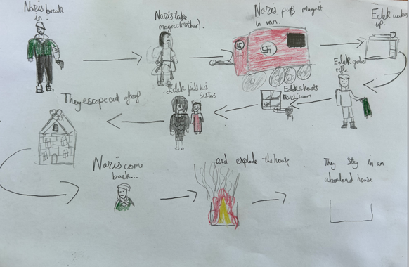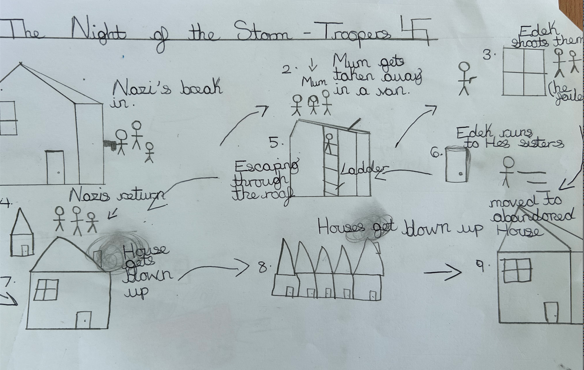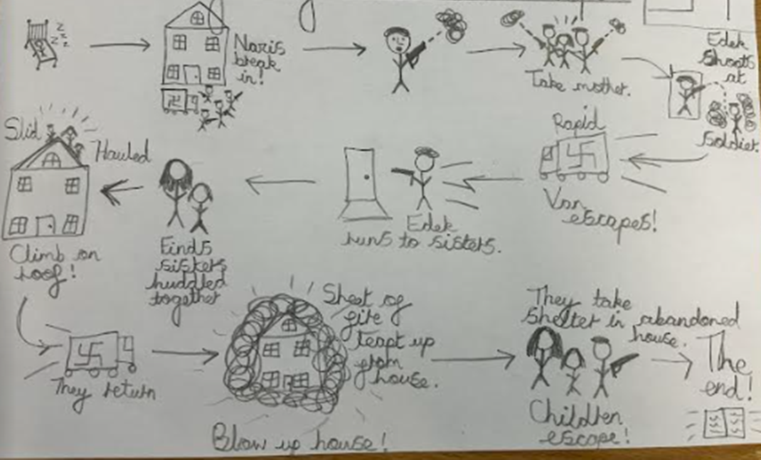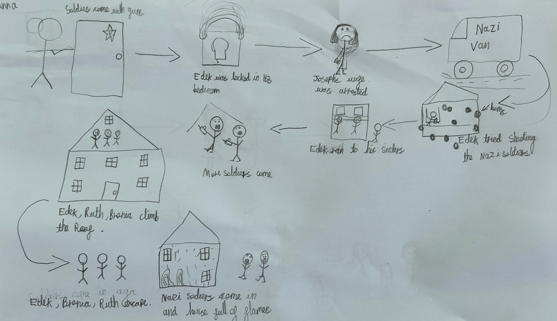 In our next writing cycle, we are going to be retelling the events of the Nazi invasion from the perspective of Joseph’s youngest daughter, Bronia. We drew our own story map to ensure we were clear about the key events within the chapter. We added ambitious language from the text to our maps.